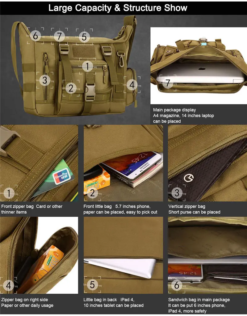 Designed for durability and functionality, this tactical shoulder messenger bag is the ultimate choice for outdoor enthusiasts, travelers, and anyone who values organized storage on the go. With its rugged military-inspired design and multi-compartment structure, it provides a reliable way to carry your essentials while keeping them secure and easily accessible.