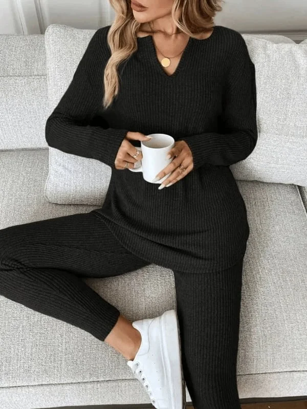 😊👗 Wrap yourself in cosy comfort with the Women’s Ribbed Plush Knit Lounge Co-Ord Set — a soft, stretchy knit ensemble designed for relaxed days, chilled evenings, and effortless everyday style. With its fitted long-sleeved top and matching ribbed plush knit trousers, this set hugs the body gently while feeling light, breathable, and comfortable enough to wear all day through autumn and winter.