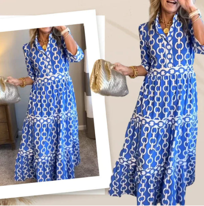 Women’s Geometric Print V Neck Tiered Maxi Dress with Pockets