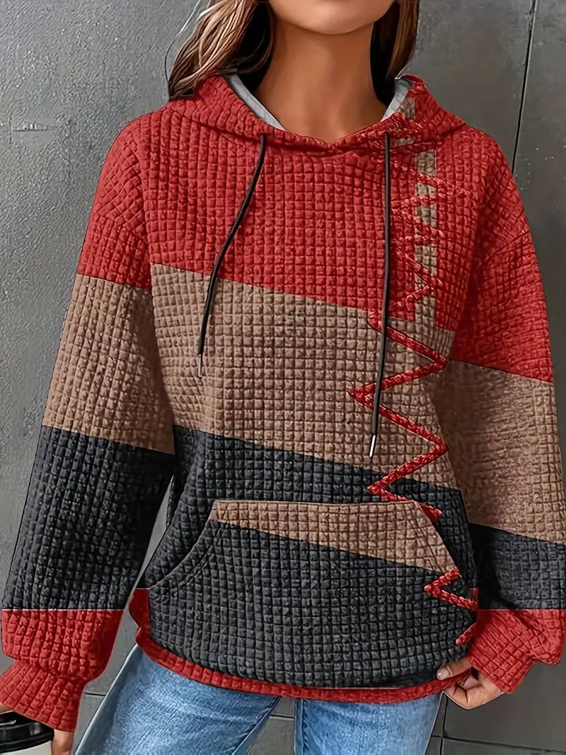 Women's Color Block Waffle Hoodie – Casual Long Sleeve with Kangaroo Pocket